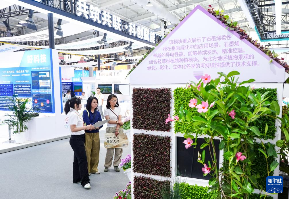 9月12日,在服贸会工程咨询与建筑服务专题展区北京城建集团展位,参展商向参观者介绍建筑垂直绿化的应用。