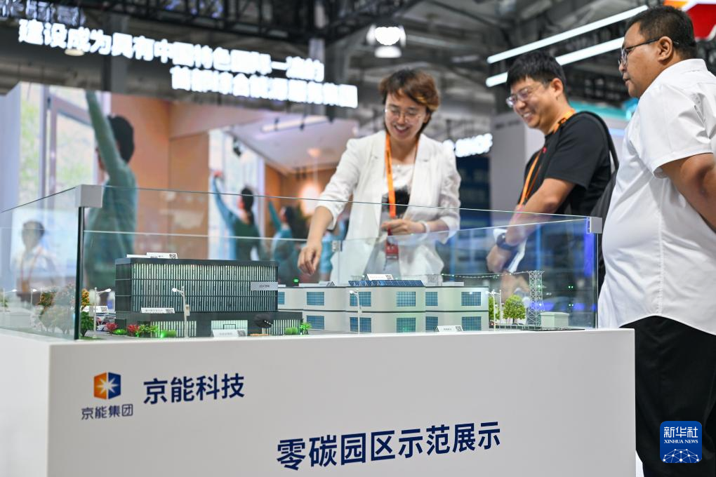9月12日,参观者在服贸会京能集团展台观看零碳园区示范展示沙盘模型。
