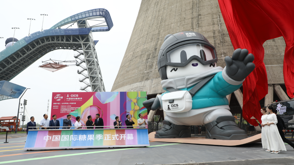 中国国际糖果季开幕式上,在首钢滑雪大跳台和冷却塔旁,嘉宾们为糖果季原创IP“糖果精灵”揭幕,开启了一场产业变革与消费升级的深度对话。