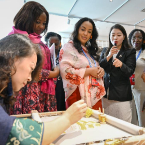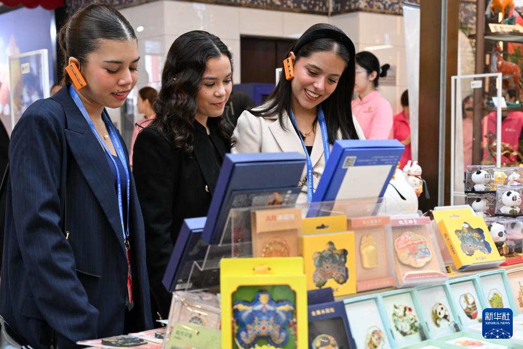 10月14日,全球妇女峰会参会嘉宾在北京市秀水街大厦参访。这是嘉宾了解北京文创产品。