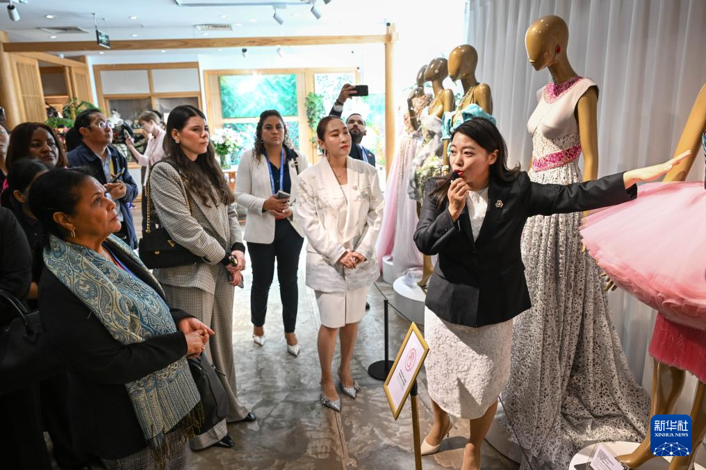 10月14日,全球妇女峰会参会嘉宾在北京市秀水街大厦参访。这是嘉宾了解高端定制服饰产品。