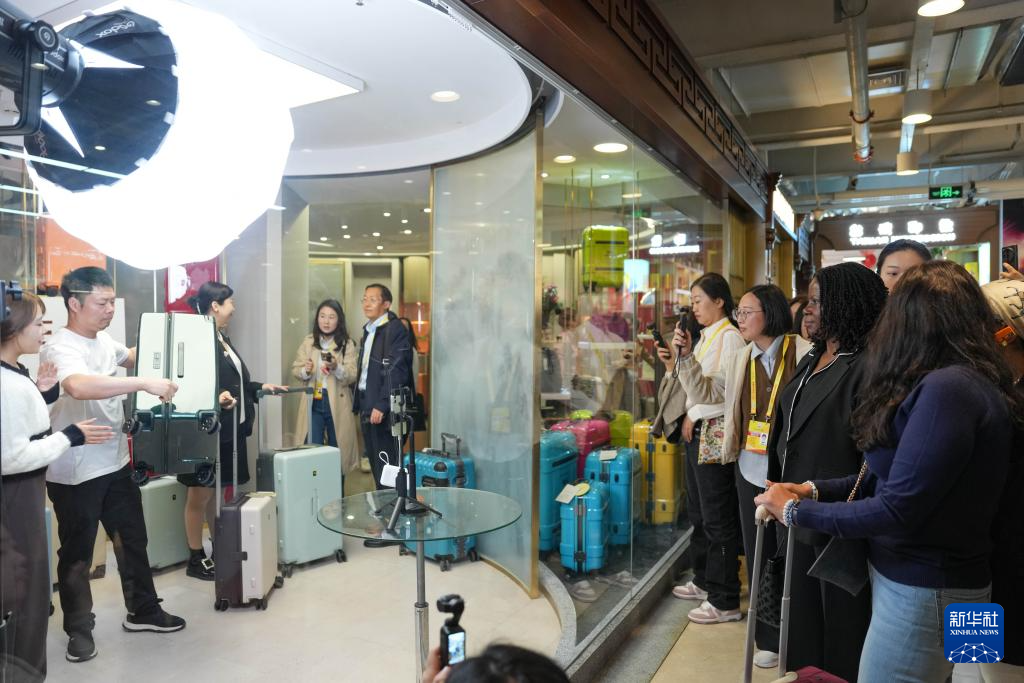 10月14日,全球妇女峰会参会嘉宾在北京市秀水街大厦参访。这是嘉宾观看电商直播。