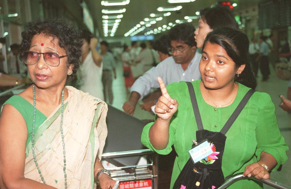 1995年8月28日,北京医科大学孟加拉国籍留学生罗可茜(右)在首都机场帮助从印度来北京参加95妇女论坛的一位女士办理手续。