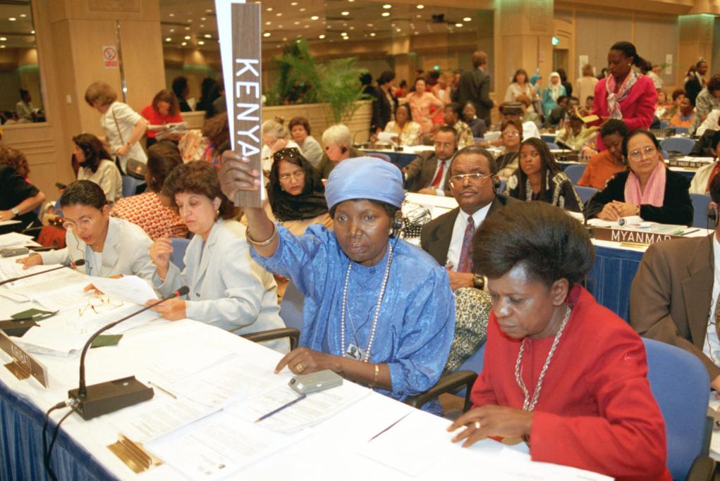 1995年9月5日以来,世妇会分组讨论全面展开。这是肯尼亚代表格雷斯·奥哥特夫人在参加审议《行动纲领》草案的讨论时,举牌要求发言。