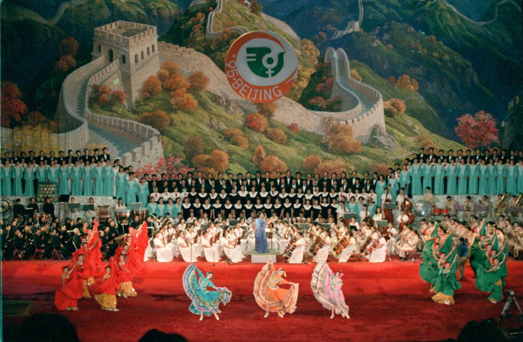 1995年9月4日,中国政府为联合国第四次世界妇女大会召开在北京人民大会堂举行欢迎仪式。这是欢迎仪式上的文艺演出场景。