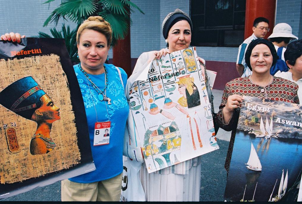 1995年,世界妇女大会期间,几位埃及代表在场外展示本国文化旅游的宣传画。