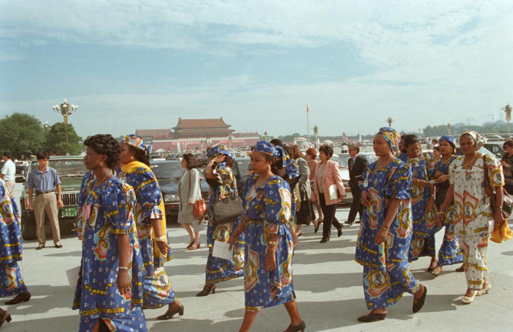 1995年9月4日,中国政府为联合国第四次世界妇女大会召开在北京人民大会堂举行欢迎仪式。这是参加欢迎仪式的各国与会人员来到北京天安门广场。