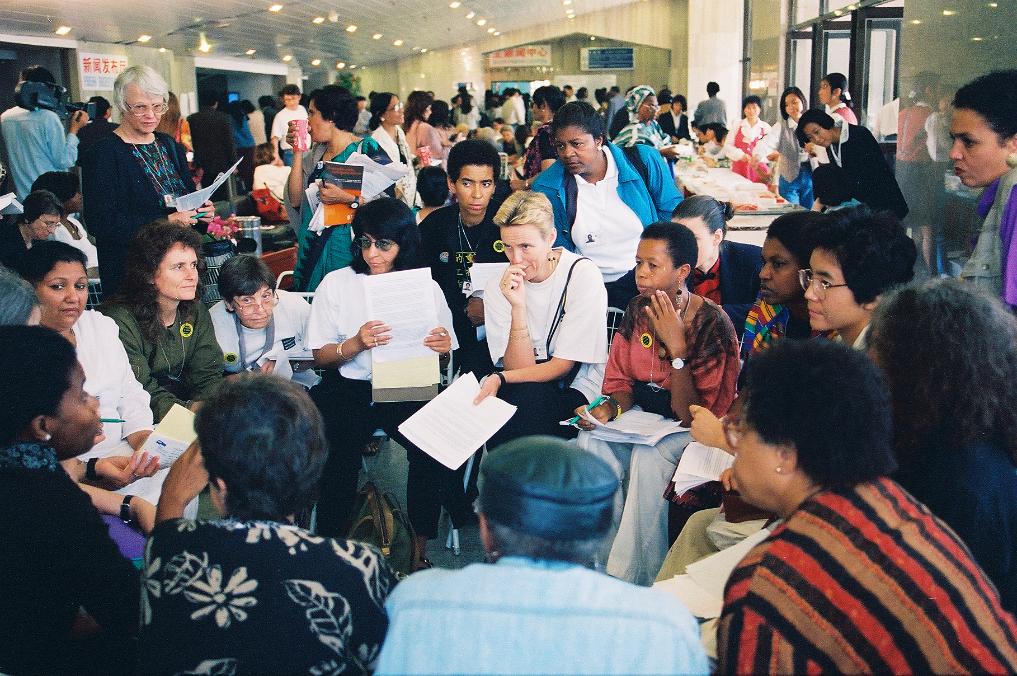 1995年世妇会上,代表们围坐在一起讨论问题。