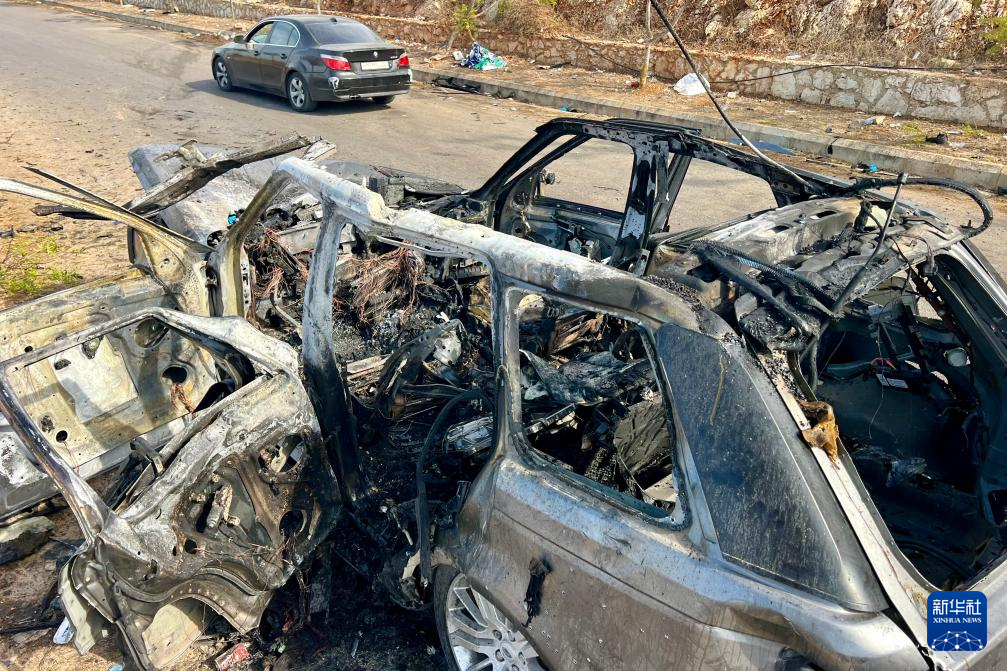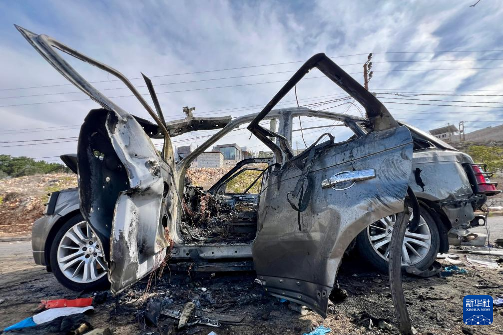 这是11月2日在黎巴嫩南部一村庄拍摄的遭袭汽车残骸。新华社发(阿里·哈希绍摄)